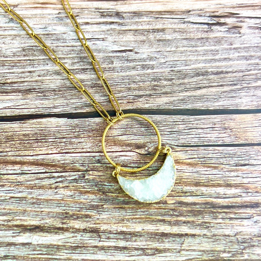 White Druzy Crescent Gold Necklace