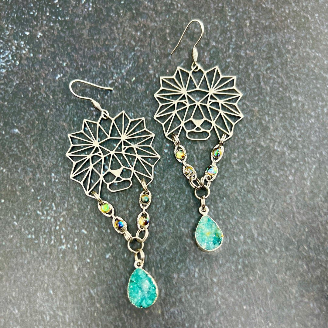 Geometric Lion Druzy Steel Earrings